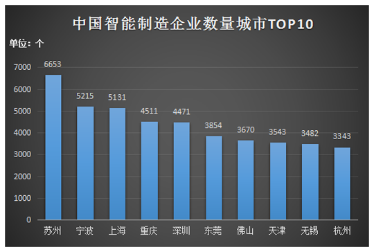 6.【企業(yè)分布】據(jù)《世界智能制造中心發(fā)展趨勢報(bào)告(2019)》報(bào)告顯示,智能制造企業(yè)數(shù)量排前十的城市,分別是蘇州、寧波、上海、重慶、深圳、東莞、佛山、天津、無錫和杭州。其中蘇州數(shù)量最高達(dá)6653家;寧波和上海旗鼓相當(dāng),分別為5215家和5131家。
